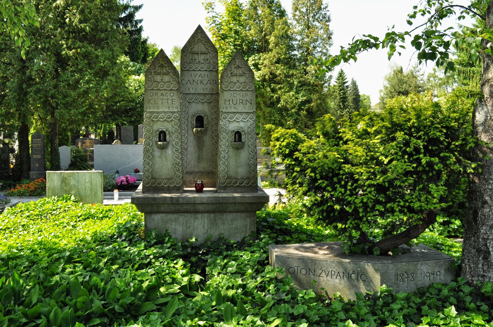 Nagrobnik za Ketteja, Murna in Cankarja je naročila in plačala Milena Rohrmannova, ki je dala leta 1923 najprej urediti skupni grob predstavnikov slovenske moderne. Spomenik je v Plečnikovi šoli zasnoval Dušan Grabrijan, postavljen pa je bil leta 1925. Župančičev nagrobni spomenik, izdelan po načrtu pesnikovega sina arhitekta Marka Župančiča, je bil odkrit junija 1955. Več si preberite na spodnjih povezavah: